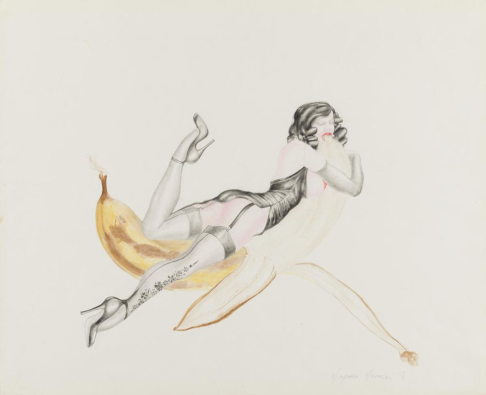 Like sexuality, the practice of feminism is common within art. An example of where the two overlap is Margaret Harrison’s “Banana Woman, 1971). She uses this illustration of a woman posed seductively to speak about many issues that affect women “such as equal pay, homeworkers’ rights, domestic abuse and rape.” An interesting choice to continue to ‘use’ women for sex appeal, to raise awareness. She is almost using the male gaze in an attempt to benefit women. The artist describes this series of work as “anti-pornographic’ because they were drawn by a woman”. This sexist double standard complicates audience interpretation and interactions. She is creating more visuals supporting the patriarchal standards set for women, when viewed without context they could support the male gaze. Evidenced by their first showing in 1971, this “was closed by police after one day for being ‘indecent’.”